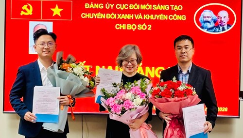 Trong không khí phấn khởi của những ngày đầu năm mới 2026, hướng tới việc triển khai đồng bộ các nhiệm vụ chính trị trọng tâm của năm và các giai đoạn tiếp theo, ngày 05/01/2026, Chi bộ 2 thuộc Cục Đổi mới sáng tạo, Chuyển đổi xanh và Khuyến công (Cục ĐCK) đã long trọng tổ chức Lễ kết nạp đảng viên mới cho 03 quần chúng ưu tú, đồng thời tiến hành sinh hoạt chi bộ thường kỳ tháng 01/2026.