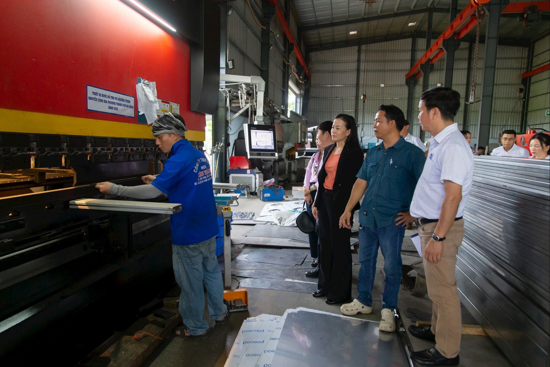 Phó Giám đốc Sở Công Thương Đỗ Thị Quỳnh Trâm (thứ 2, bên phải sang) cùng đoàn nghiệm thu bàn giao máy móc tại Công ty CP Thương mại và sản xuất Asia Green. Ảnh: V.HOÀNG