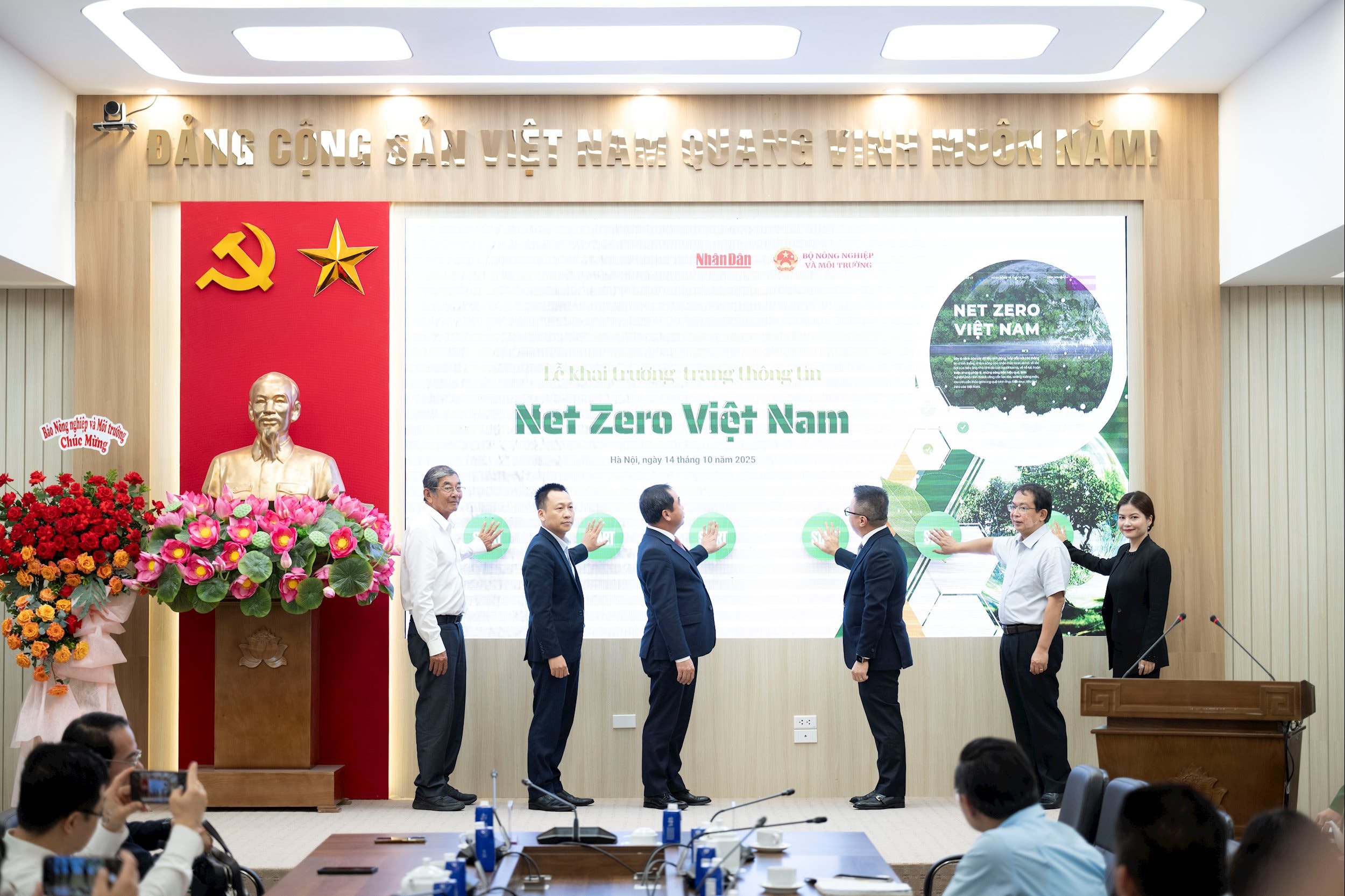 Quyền Bộ trưởng Bộ Nông nghiệp và Môi trường Trần Đức Thắng, Tổng Biên tập Báo Nhân dân Lê Quốc Minh và các đại biểu bấm nút khai trương chuyên trang “Net Zero Việt Nam”