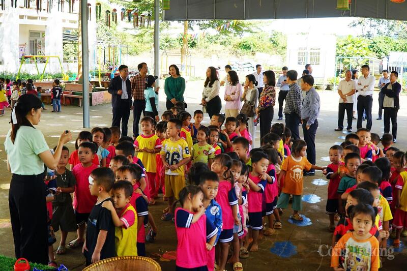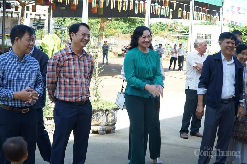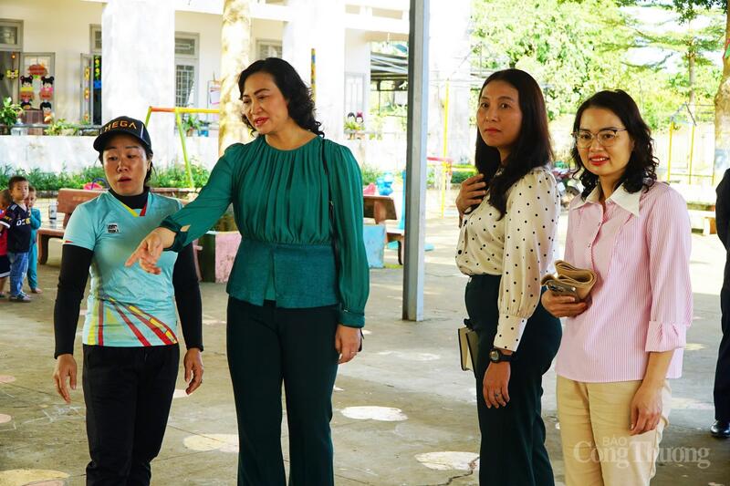 Thứ trưởng Bộ Công Thương Phan Thị Thắng (ở giữa) tham quan Trường mẫu giáo Hoa Đào (thôn 4, xã Tà Đùng). Ảnh: Vũ Long