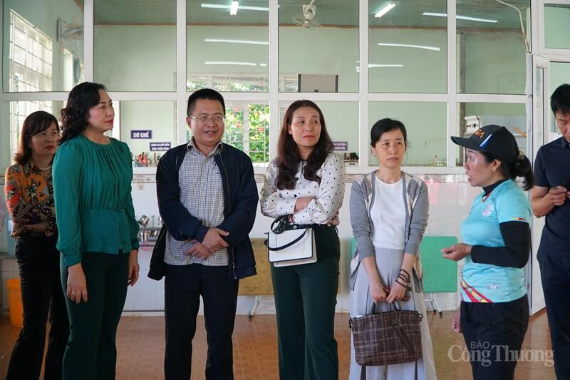 Thứ trưởng Bộ Công Thương Phan Thị Thắng tham quan bếp ăn của Trường mẫu giáo Hoa Đào (thôn 4, xã Tà Đùng). Ảnh: Vũ Long