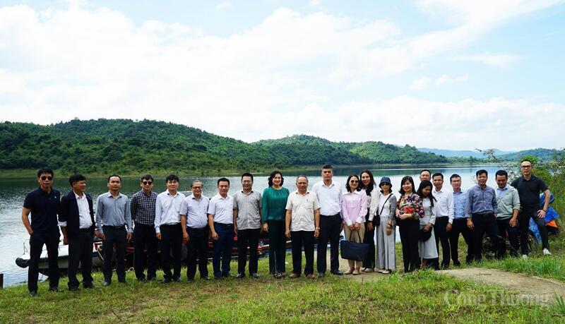 Thứ trưởng Bộ Công Thương Phan Thị Thắng cùng đoàn công tác Ban chỉ đạo Trung ương các chương trình mục tiêu Quốc gia chụp ảnh lưu niệm với lãnh đạo địa phương tại khu du lịch Tà Đùng. Ảnh: Vũ Long