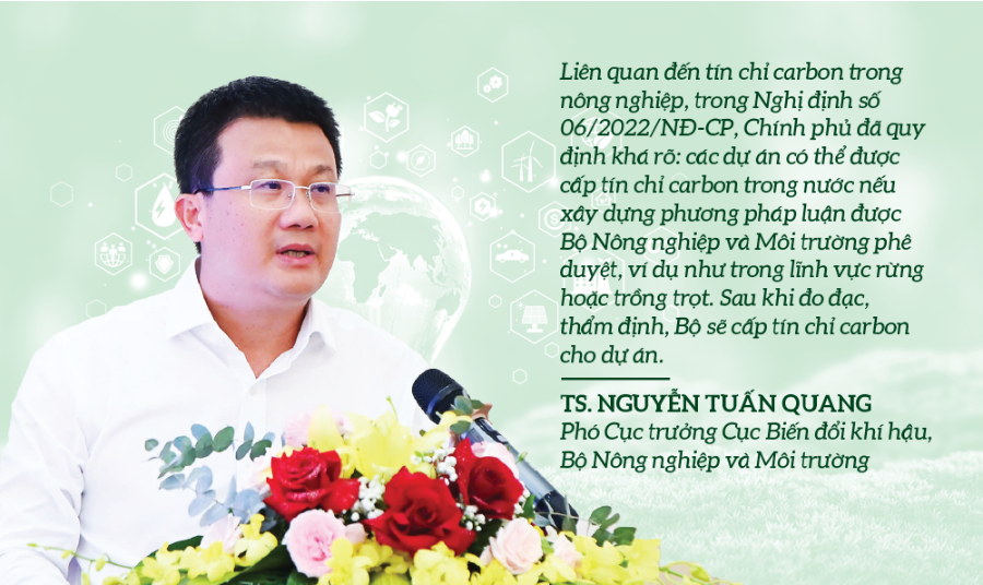 Liên quan đến tín chỉ carbon trong nông nghiệp, Chính phủ đã quy định rõ ràng về việc cấp tín chỉ carbon cho các dự án trong nước. Tuy nhiên, để được bán tín chỉ carbon, các dự án cần tuân thủ các phương pháp luận quốc tế và được thẩm định kỹ lưỡng. Đây là lĩnh vực mới, tiềm năng nhưng phức tạp, đòi hỏi sự phối hợp chặt chẽ giữa các cơ quan quản lý, doanh nghiệp và địa phương để hoàn thiện khung kỹ thuật, pháp lý và tài chính.