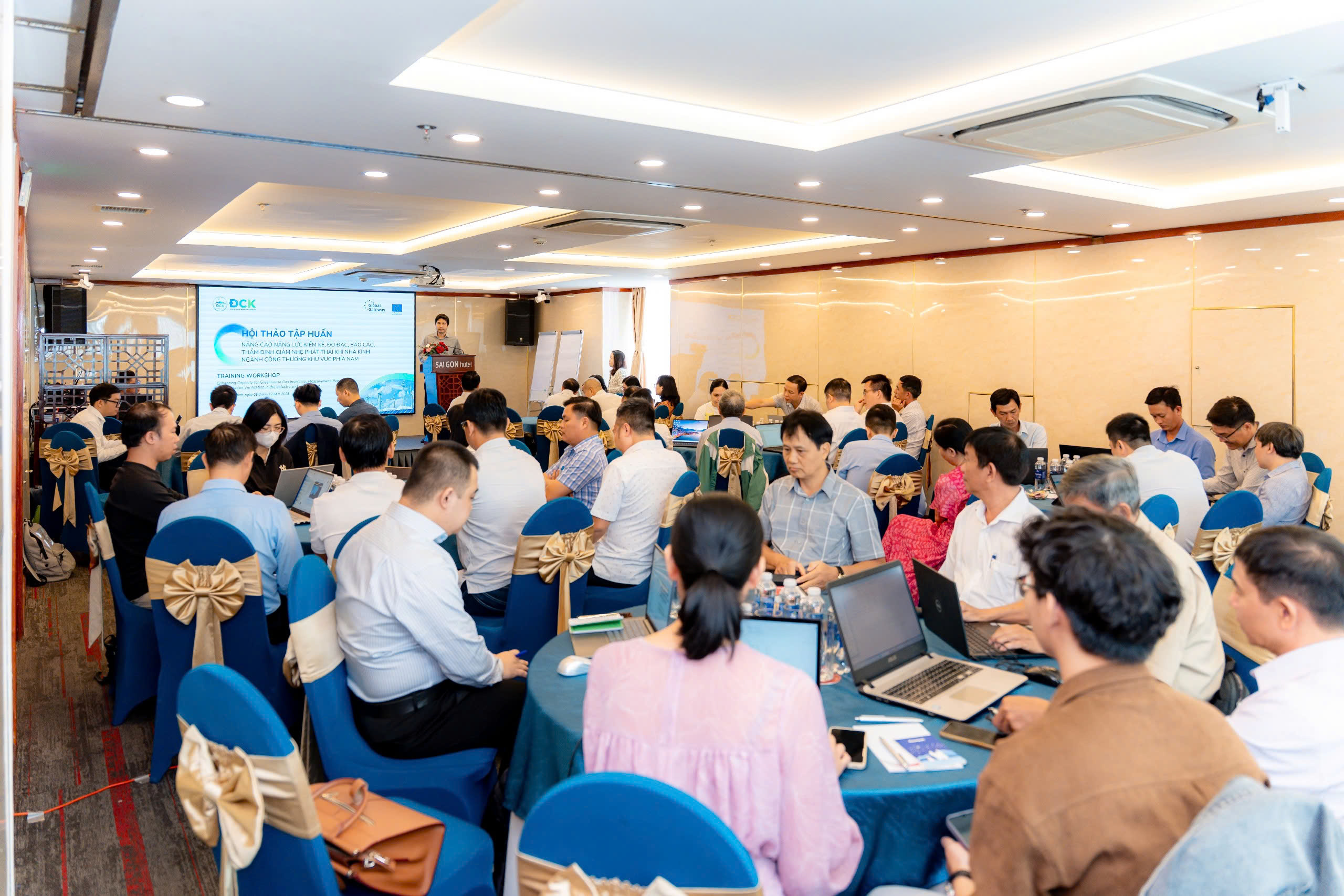 Bước sang buổi chiều, nội dung tập huấn đi vào thực hành chuyên ngành. Các chuyên gia đến từ Công ty Enerteam trình bày hướng dẫn kỹ thuật kiểm kê và xây dựng kế hoạch giảm phát thải khí nhà kính trong lĩnh vực bia và nước giải khát – một trong những ngành có lượng phát thải lớn và phải thực hiện kiểm kê bắt buộc. Các đại biểu sau đó tham gia thực hành sử dụng công cụ tính toán kiểm kê và lập kế hoạch giảm nhẹ phát thải, trước khi thảo luận về kết quả, trao đổi kinh nghiệm và đề xuất điều chỉnh phù hợp điều kiện thực tế tại từng địa phương, doanh nghiệp.