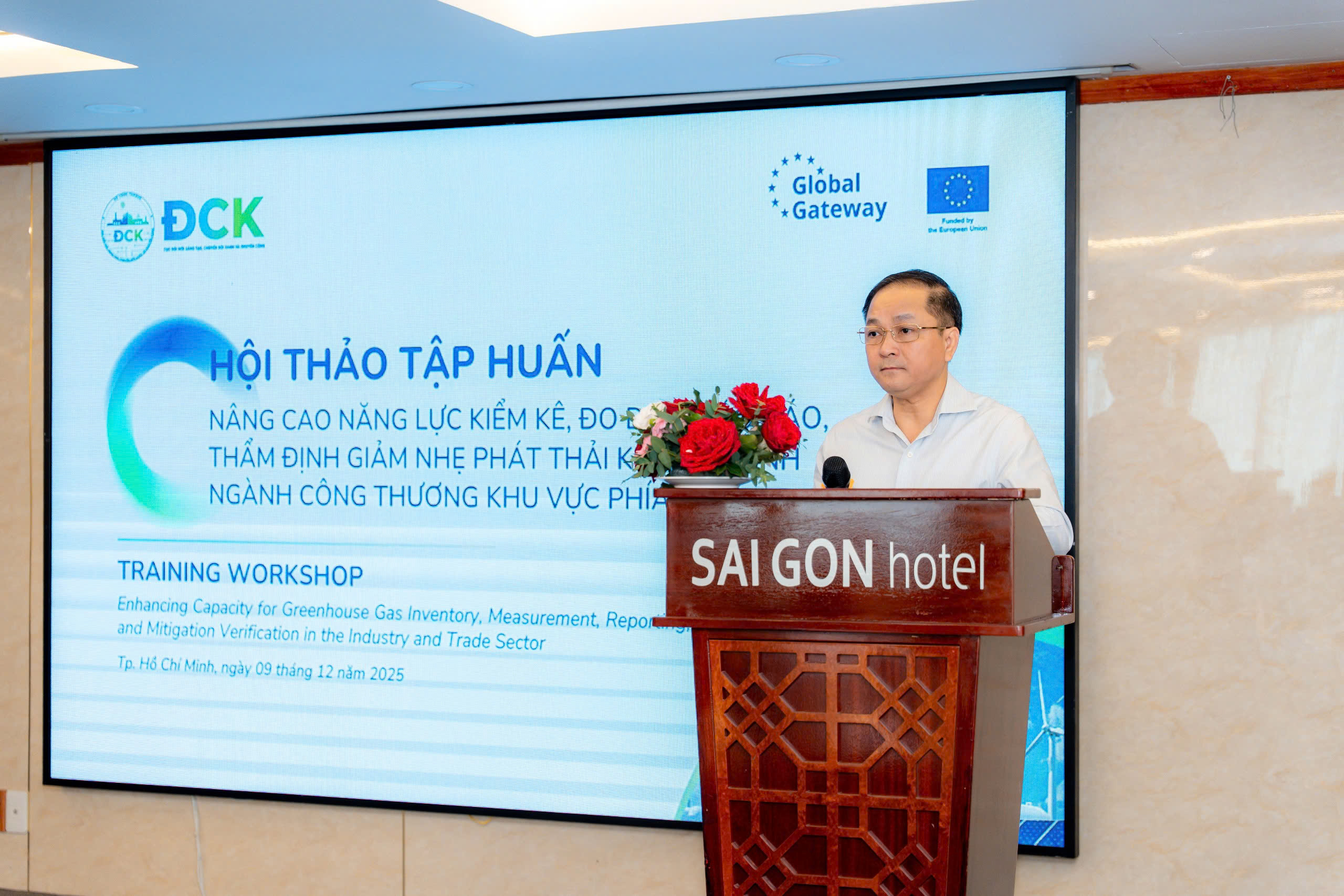 Tiếp theo Hội thảo cập nhật, phổ biến các quy định của pháp luật về giảm nhẹ phát thải khí nhà kính và ứng phó với BĐKH ngành Công Thương ngày 18/11/2025 tại Hà Nội, ngày 9/12/2025 tại TP.HCM, Cục Đổi mới sáng tạo, Chuyển đổi xanh và Khuyến công (Cục ĐCK) đã tổ chức Hội thảo tập huấn hướng dẫn Quy định kỹ thuật đo đạc, báo cáo, thẩm định giảm nhẹ phát thải nhà kính và kiểm kê khí nhà kính ngành Công Thương năm 2025 cho các đơn vị, địa phương khu vực phía Nam.