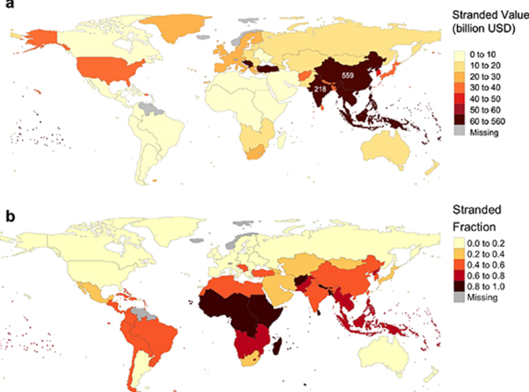 Rủi ro ‘tài sản mắc kẹt’ của các nhà máy than theo từng khu vực trong kịch bản giới hạn nóng lên toàn cầu 1,5 °C. Biểu đồ này cảnh báo về rủi ro tài chính của quá trình chuyển đổi năng lượng khi các khoản đầu tư vào nhiên liệu hóa thạch hôm nay có thể trở thành gánh nặng, các tài sản ‘chết’ trong tương lai. Nguồn: Morgan R. Edwards và cộng sự- Environmental Research Letters.