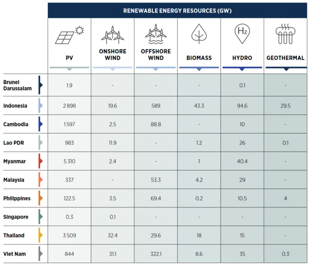 Số liệu thể hiện tiềm năng kỹ thuật (GW) để phát triển các nguồn năng lượng tái tạo của các quốc gia ASEAN. Ví dụ, Việt Nam nổi bật với tiềm năng điện gió ngoài khơi (322,1 GW) và điện mặt trời (844 GW). Nguồn: IRENA